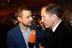 Als ich mein Glas Wein zahlen will, lacht mich Torsten aus. Alles gratis. Auch Champagner. So viel Frau will. Und bevor alle aus dem Saal stürmen, soll ich doch mal Richtung Essen schauen. In jedem Foyer ein anderer Spitzenkoch. Gerade als ich mir ein Rote-Bete-Kartoffel-Risotto mit Meerrettichschaum und Gartenkresse holen wollte, fragten mich die Herren hinter mir, ob ich denn nicht lieber Gemüsemaultaschen mit Pinienkernschmelze, Waldpilzen und Gewürzveloute hätte. Und so kam es, dass ich mit Ulli Zelle und den Herren vom Rbb Fernsehen einen Stock höher zu Abend aß.  Der Ulli, der kennt wirklich jeden hier. Und jeder kennt ihn.