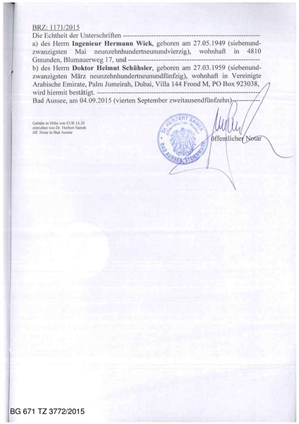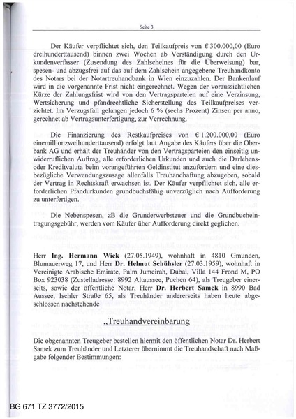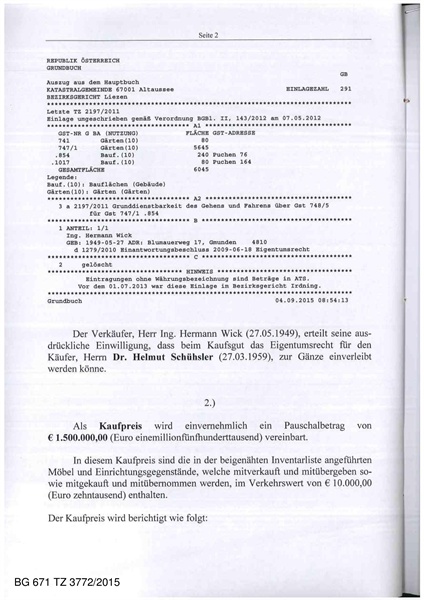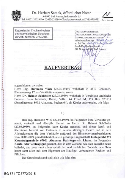Interessant ist aber auch der Kauf durch Dr. Schühsler von Herrn Ing. Hermann Wick. Die Villa wechselte im Jahre 2015 um 1,5 Millionen Euro den Eigentümer. Im Kaufpreis enthalten war fast das gesamte Inventar, das, laut Kaufvertrag, einen Verkehrswert von etwa 10.000 Euro hatte. Also ist es vom Wert her zu vernachlässigen.