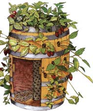 Nutzen Sie ein altes Fass als Topf für Ihre Erdbeeren. Machen Sie eine Reihe von Löchern im Abstand von 15-20cm und einem Durchmesser von 6cm in das Fass. Machen Sie auch ein Loch in den Deckel und stellen Sie das Fass auf vier Ziegel. Den Grund des Fasses füllen Sie mit Hydrokulturkugeln und geben eine Plastikröhre mit Löchern oder einen Zylinder aus metallischem Drahtnetz (mit einem Durchmesser von 6-10cm) senkrecht in das Fass, das Sie ebenfalls bis zur Mitte mit Hydrokulturkugeln füllen. Danach fangen Sie an, das Fass mit Erde zu füllen. Wenn Sie zu den Löchern (im Fass) kommen, pflanzen Sie die Erdbeeren (so dass die Pflanze aus dem Loch herauswächst) und fahren so bis nach oben fort. Über die Röhre können Sie dann Ihre Erdbeeren gießen.