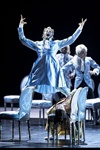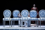 Jürgen Kirner gibt mit seiner Bühnengestaltung den Stil des 18. Jahrhunderts sehr elegant wieder. Einerseits sind es seidig bestickte blaue Stühle, angepasst an die blaue