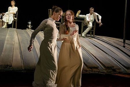 Faszinierend und gleichzeitig bedrückend ist die Bühnendekoration von Harald B. Thor, die aus einer Art Floß mit daran befestigtem Mobiliar besteht. Es befindet sich immer auf unterschiedlicher Höhe zum Boden, steht aber nie vollständig auf diesem, sondern schwebt immer zumindest teilweise und nimmt die Schauspieler in diesem hängenden Zustand laufend mit. Dahinter konnte man den symbolischen Sinn erkennen, dass die Familie Schelesnowa turbulente Zeiten erlebt und als eine Familie keinen Zusammenhalt hat, sondern sich laufend in einem schwebenden Zustand befindet.